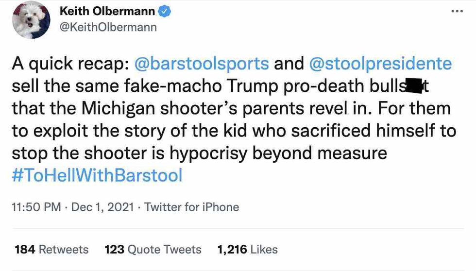 Far-left talking head Keith Olbermann has been getting pummeled on Twitter for trying to connect a story about a hero student who died after charging at the Michigan high school shooter this week to what Olbermann termed the "Trumpist Fascism" of the shooter's mother — as well as Barstool Sports and its founder, Dave Portnoy.