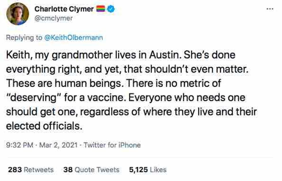 "Keith, my grandmother lives in Austin," Clymer wrote. "She's done everything right, and yet, that shouldn't even matter. These are human beings. There is no metric of 'deserving' for a vaccine. Everyone who needs one should get one, regardless of where they live and their elected officials."