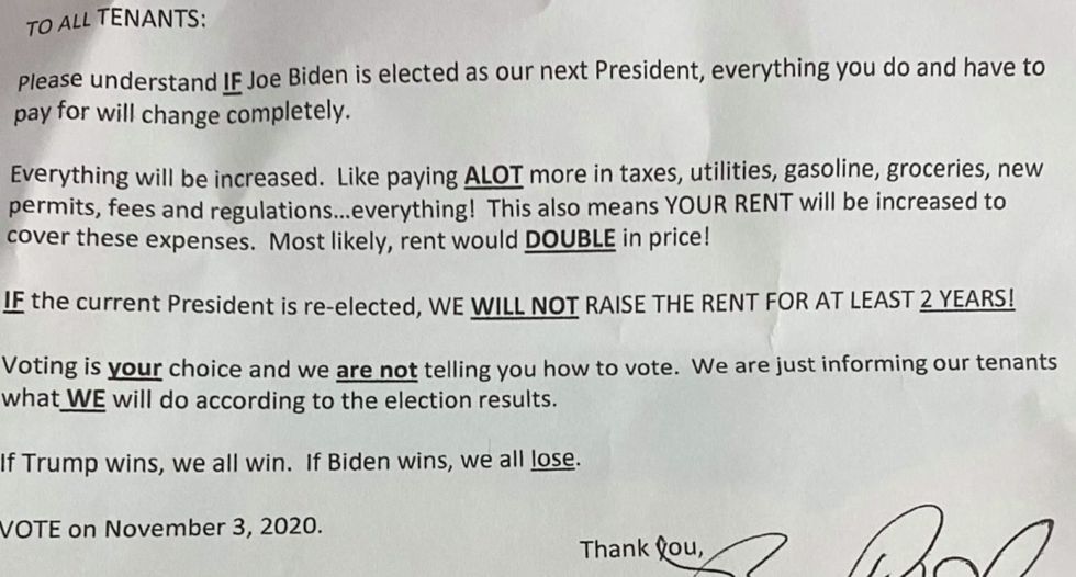 The letter explains that their rent would not be raised for at least two years if Trump were re-elected, but adds that if Biden is elected, their rent will "most likely double."