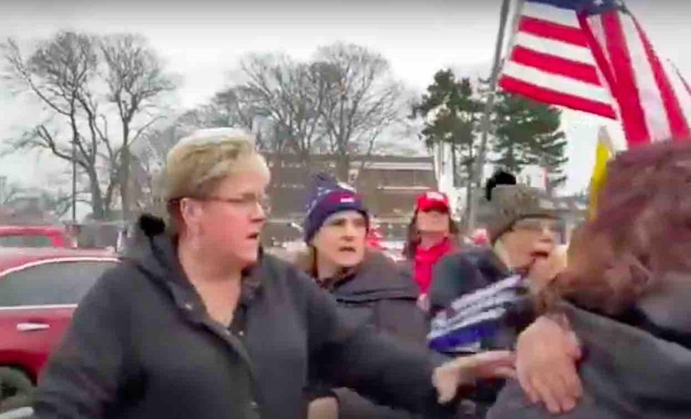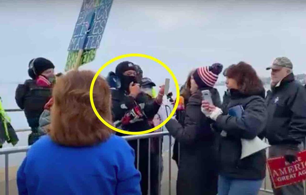 Ernst Jean-Jacques, Jr., gives the finger to supporters of President Donald Trump at a rally for him in Swampscott, Massachusetts, on Saturday. (Image source: YouTube screenshot, redacted)