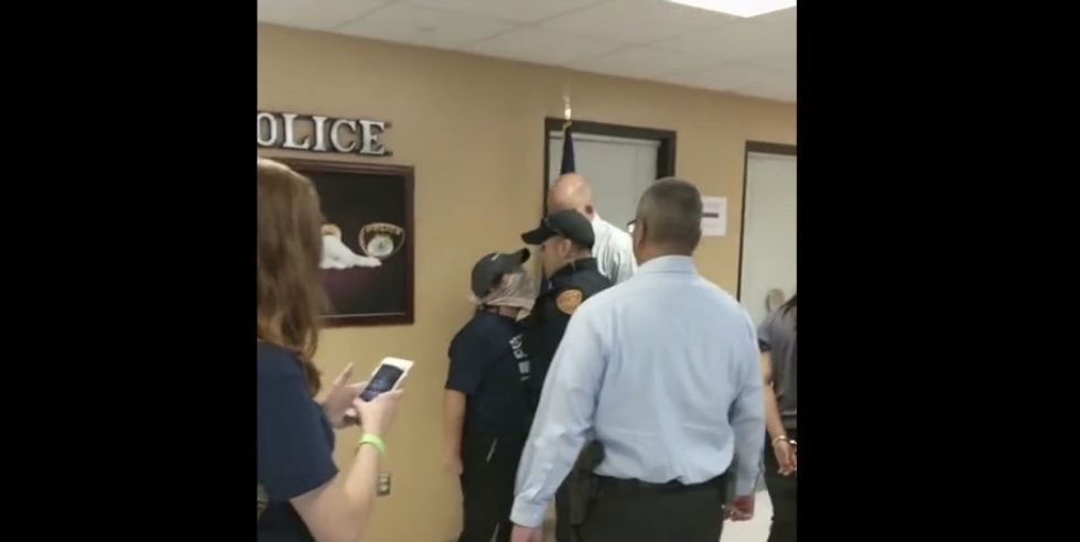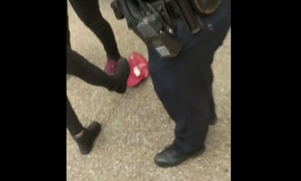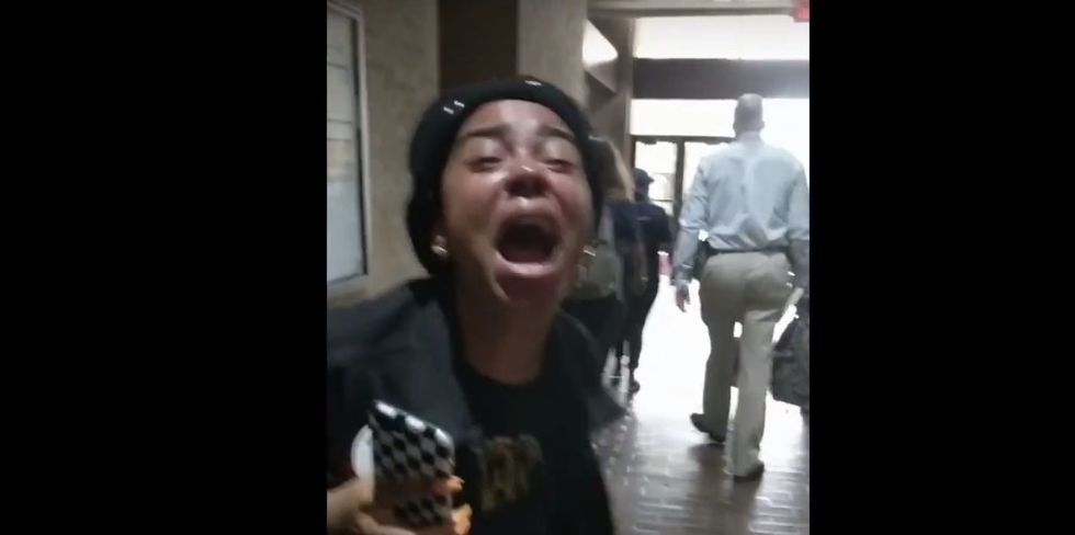 As police led the arrested individuals through a building, the student who earlier was screaming and crying hysterically upped things quite a bit, getting in the MAGA-hat student's face and bellowing, "Get out! Why are you here?! Why are you here?! Leave!"