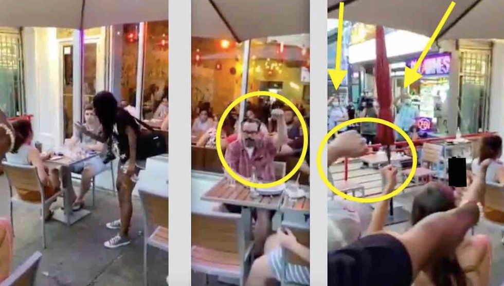 In another clip, leftists harass a couple seated outside another restaurant, presumably for the same reason: The man and woman won't raise their fists like their fellow patrons seated around them.