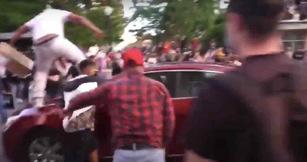Video shows the bicyclist, who didn't fall to the ground, quickly began beating on Hawkins' car — and a bunch of other left-wing George Floyd protesters followed suit and swarmed the vehicle.