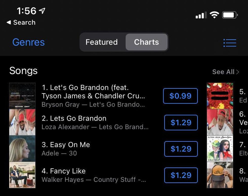 But on Tuesday, the opposite happened. Adele's single actually slipped to No. 3, only to be replaced by yet another "Let's Go Brandon" song at No. 2, this one by rapper Loza Alexander. Gray's song remained at No. 1.