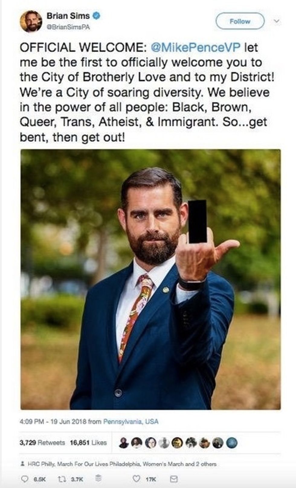 You might remember Sims from his Twitter photo giving Mike Pence a middle finger leading up to the vice president's visit to Philadelphia last June to campaign for Pennsylvania's GOP gubernatorial nominee Scott Wagner: