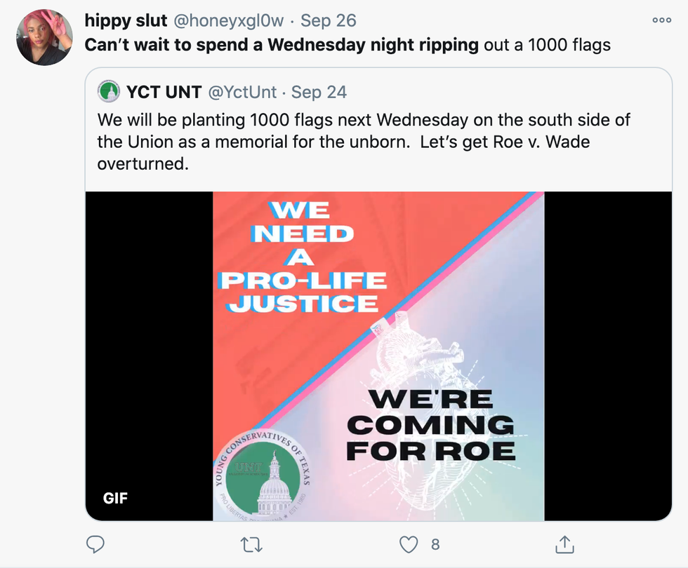 Earlier that evening, members of the school's chapter of Young Conservatives of Texas had gathered to place 1,000 flags on the school's property, according to a statement released by the organization. Each flag reportedly represented 60,000 babies killed by abortions since the Supreme Court's 1973 decision in Roe v. Wade. The memorial display was approved by the school.