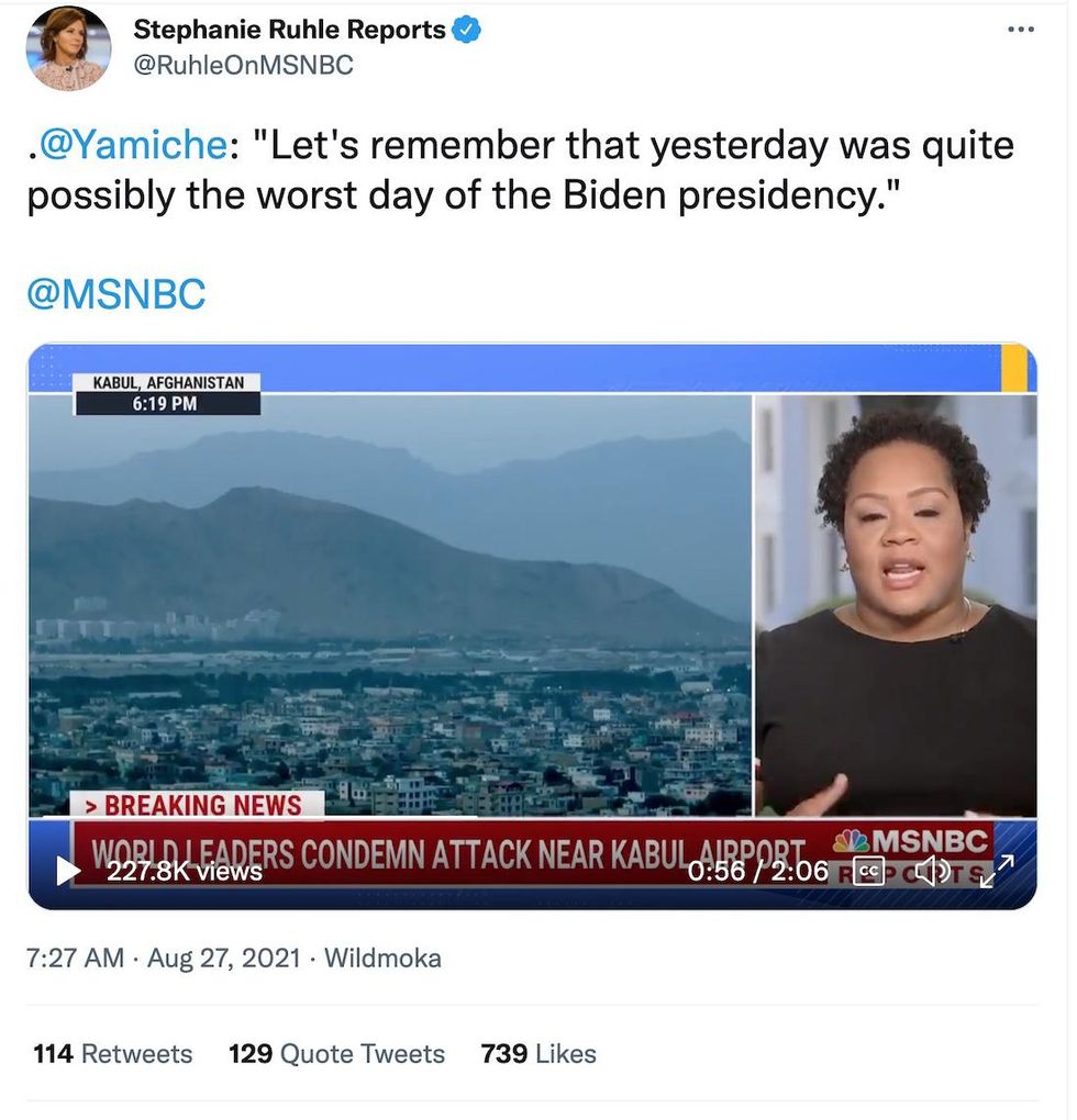 Alcindor was a guest on MSNBC when she said that the lethal terror attack in Afghanistan appeared to be the worst day of the Biden presidency.