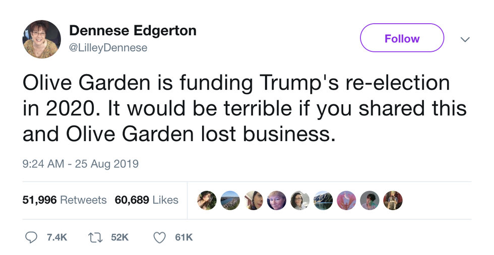 The outrage began after Twitter user Dennese Edgerton claimed Olive Garden "is funding Trump's re-election." The tweet quickly went viral, amassing more than 50,000 shares by Monday.
