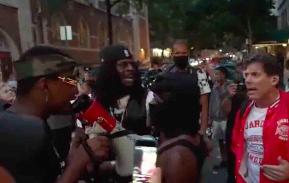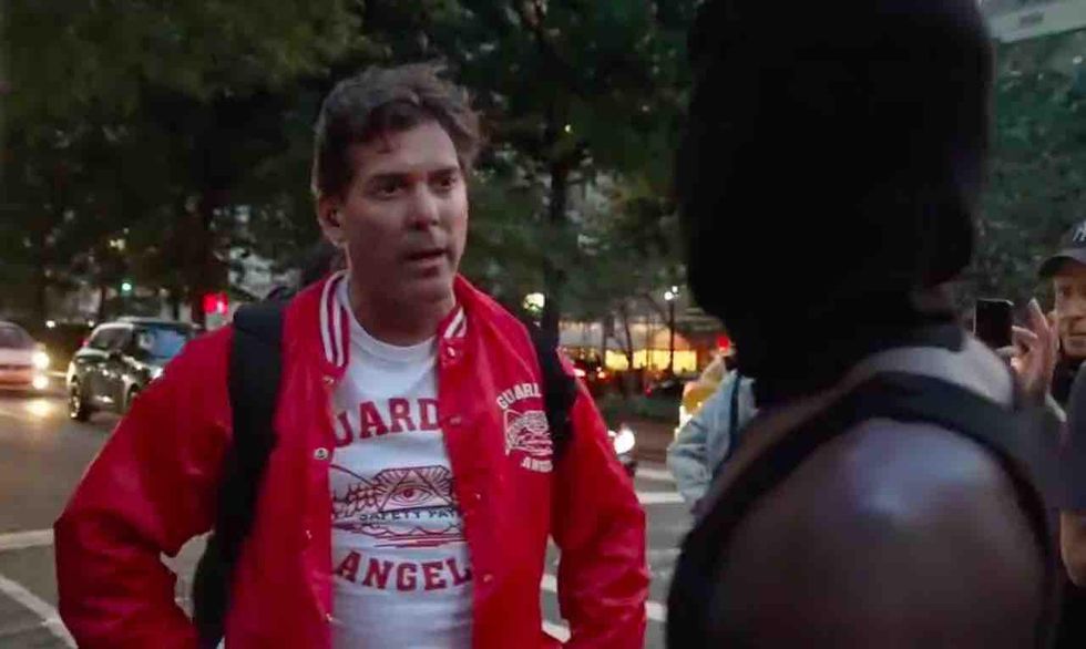 A lone Guardian Angel was seen on video standing up to multiple Black Lives Matter demonstrators who tried to bully him during their protest Monday of Carmine's restaurant in New York City — and at least one BLM protester yelled multiple anti-gay slurs, but the Guardian Angel wasn't about to let that slide, either.