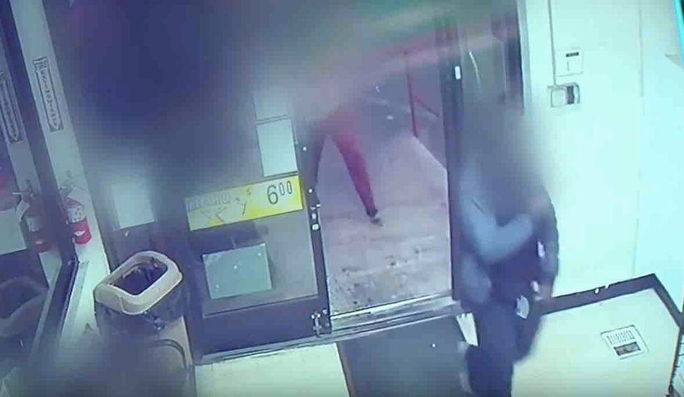 When the shot man departed the store, the clerk told the station she saw him with police: "He was right out front, and they put his hands behind his back and had him on the ground."