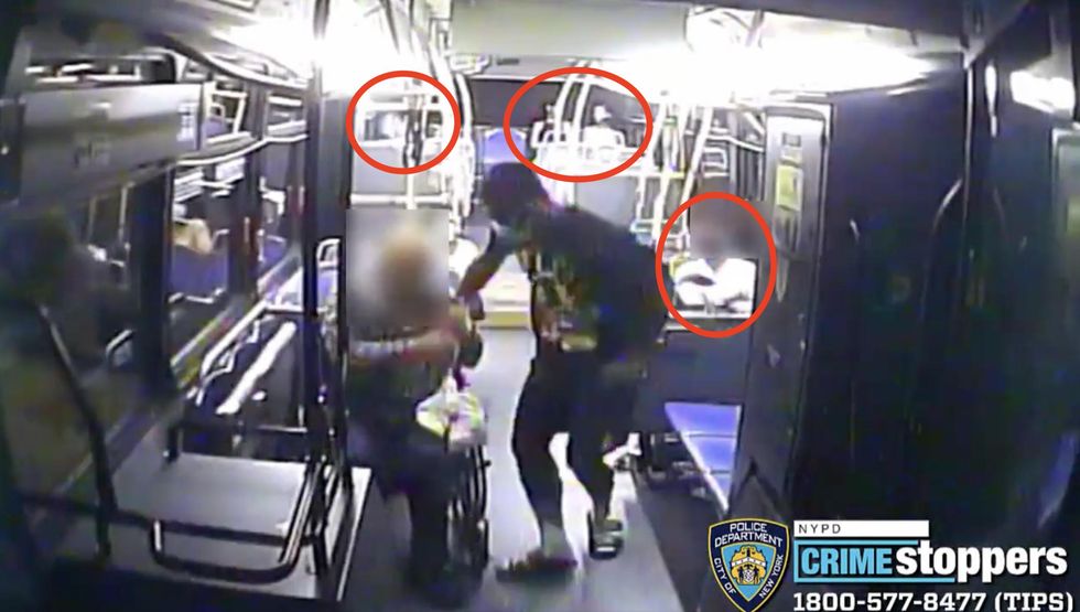 Video shows at least four other passengers seated aboard the bus at the time of the robbery, and none of them did a thing in response.