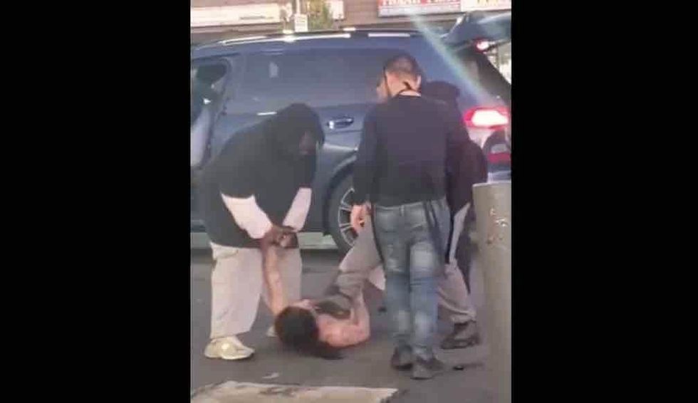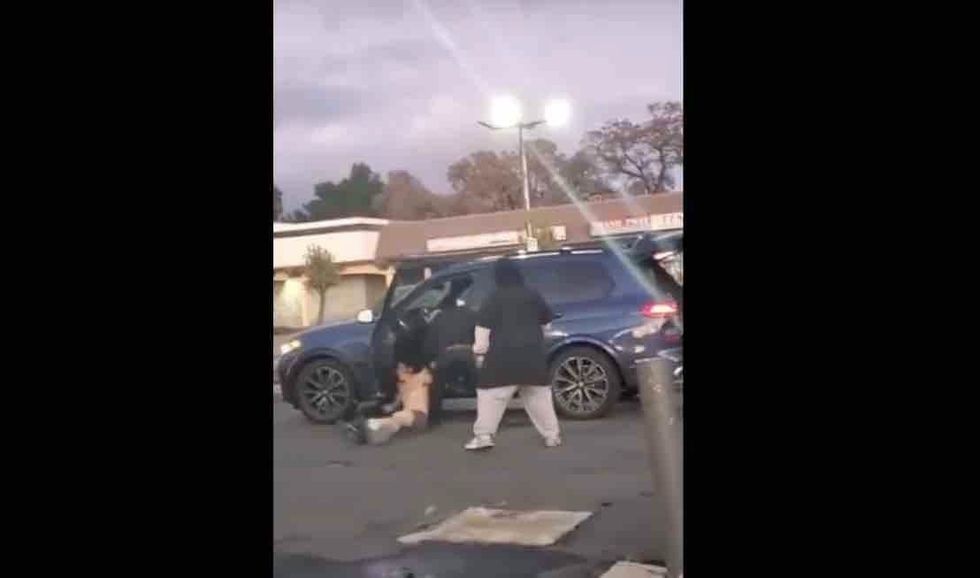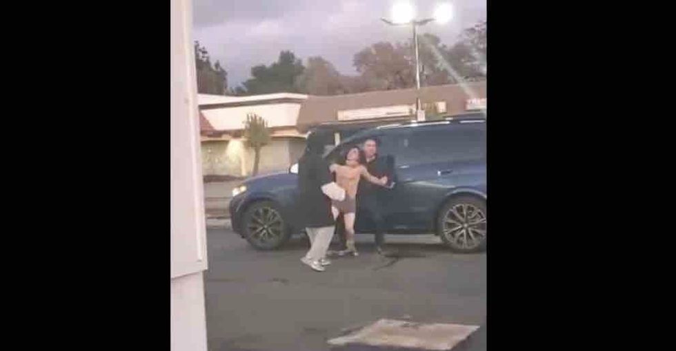 Video of the incident shows the suspect — who was shirtless and barely keeping his pants on — being dragged out of the vehicle's front seat and landing on the concrete.