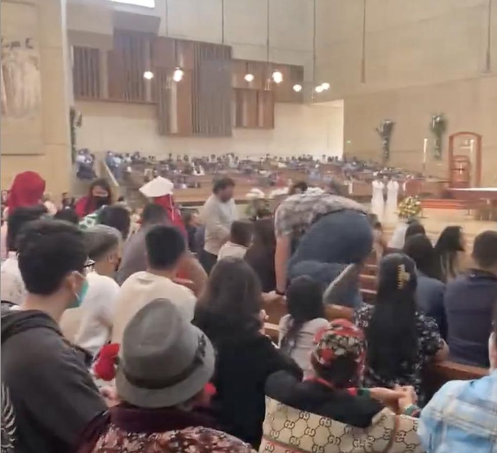 CNA said cathedral staff and parishioners intervened. Cellphone video posted on Twitter captured the moment one man dressed in jeans and a blue and white checkered shirt climbed over a pew to confront the demonstrators in an aisle: