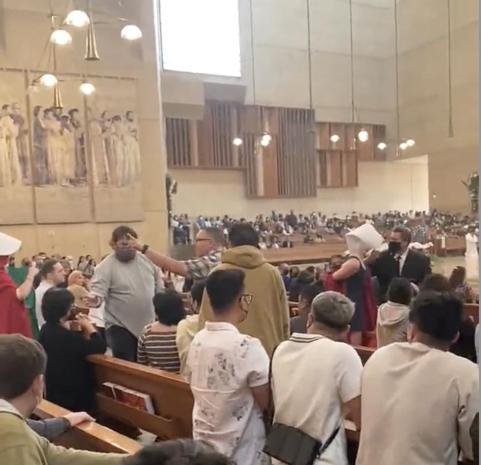 A decidedly annoyed man was caught on video climbing over a pew and stopping red-robed pro-abortion demonstrators in their tracks, cutting short their disruption of a Catholic mass Sunday in Los Angeles.