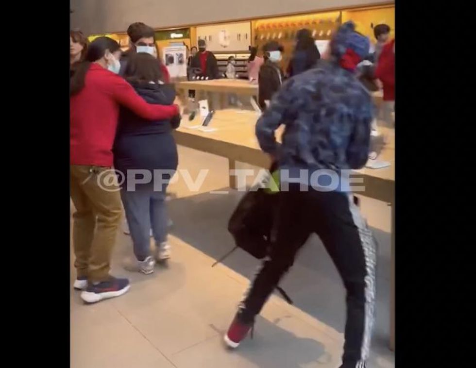 Video shows the pair quickly circulating among a large number of customers and staff and ripping multiple iPhones and laptops from their security cords at display tables, the outlet said, adding that Apple employees are seen pulling customers clear of the crooks.