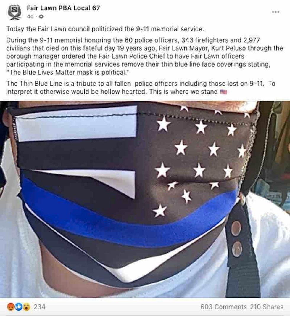 Fair Lawn PBA Local 67 said on its Facebook page that Mayor Kurt Peluso "ordered" Police Chief Glen Cauwels to tell participating officers to remove the masks since they are "political."