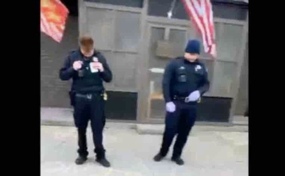 Another two officers who'd also been debating the pro-lifers appeared to bow their heads during the prayer: