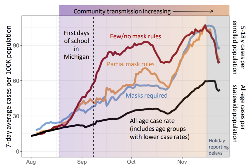 The report stated, "Case rates in 5–18-year-olds have become more similar across mask rule types."