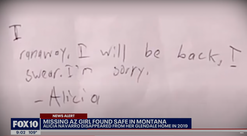 She left a note for her mother that read, "I ran away. I will be back, I swear. I'm sorry. — Alicia," the station said.