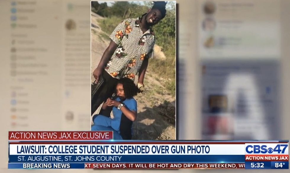 A mother who's a student at a Florida college said the school suspended her indefinitely over a photo of her and her fiance posing with guns, WJAX-TV reported.
