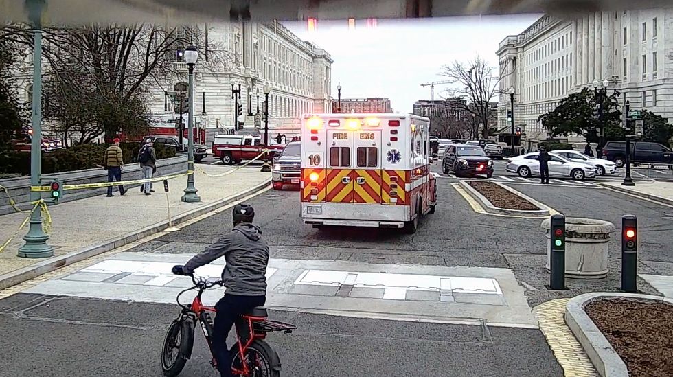 An unmarked squad car with three Capitol Police officers who would question Frack and Frick pulled in near the South Barricade at 3:02:08 p.m., crossing paths with D.C. Fire and EMS Rescue 10 with Babbitt on board.