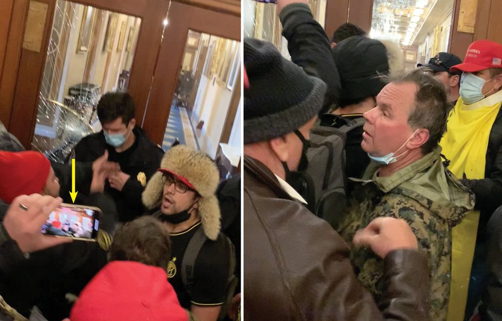 An unidentified man known only by the hashtag #HuskyMario pleaded with the officers to let the crowd pass. “We don’t want to hurt nobody. We just want to go into the House!” he shouted. Another rioter known by the hashtag #2BlueJacket got within inches of Lanciano’s face with a two-handed middle-finger taunt.