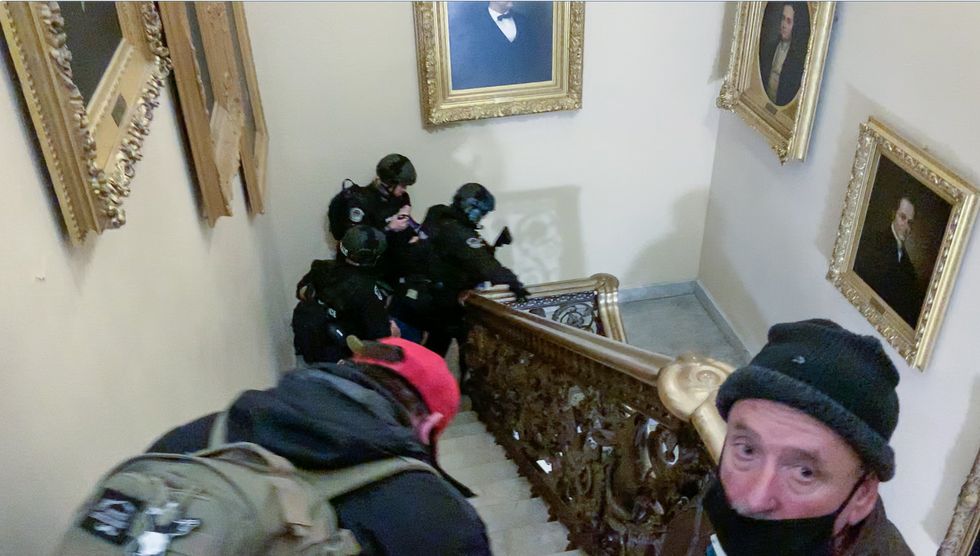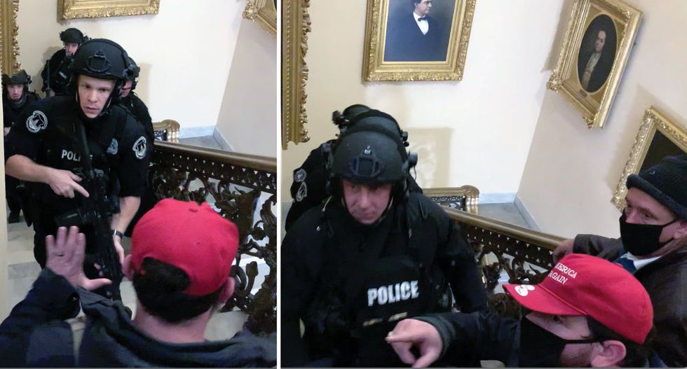 Frick grabbed the arm of protester Linwood Robinson Sr. and appeared to motion for him to step back and switch places, video showed. Shortly after, Frick led Frack down the stairs to a landing, almost colliding with a four-man Capitol Police Containment and Emergency Response Team ascending from the Hall of Columns.