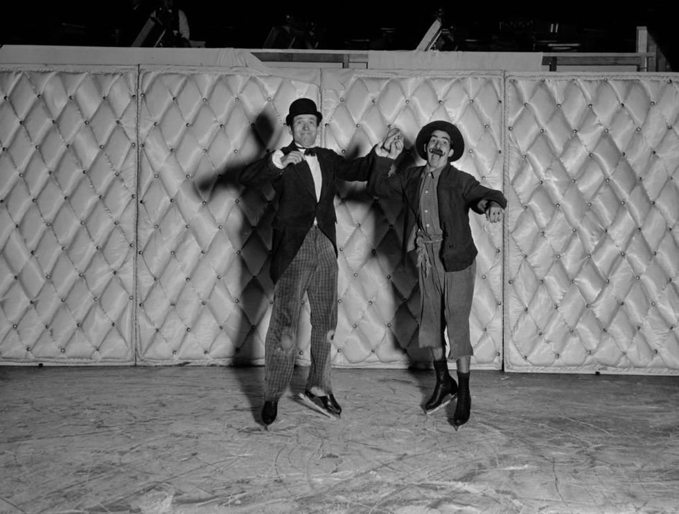A world-famous comedic skating duo known as Frick and Frack performed spectacular on-ice feats for tens of millions of U.S. fans from 1939 until late 1953. Their ice-folly antics and derring-do seemed to defy the laws of physics. Their on-rink names have since become synonymous with a closely matched set or a pair of inseparable friends.