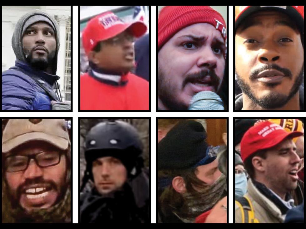 The list of unidentified material witnesses (see chart) includes #RedOnRedGlasses (second from top left), a provocateur captured on video apparently launching a long two-by-four like a javelin through a window at the Senate Wing Door at 2:12 p.m., creating the first breach of the Capitol Building.
