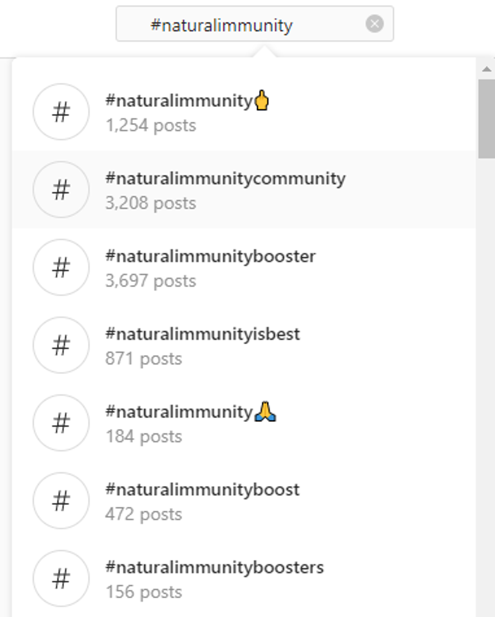 At the time of publication, the hashtag #NaturalImmunity was still completely blocked on Instagram. It appears that the censorship of the hashtag has prompted users to create related hashtags such as #NaturalImmunityCommunity, #NaturalImmunityIsBest, and #NaturalImmunity with the middle finger and prayer emojis.