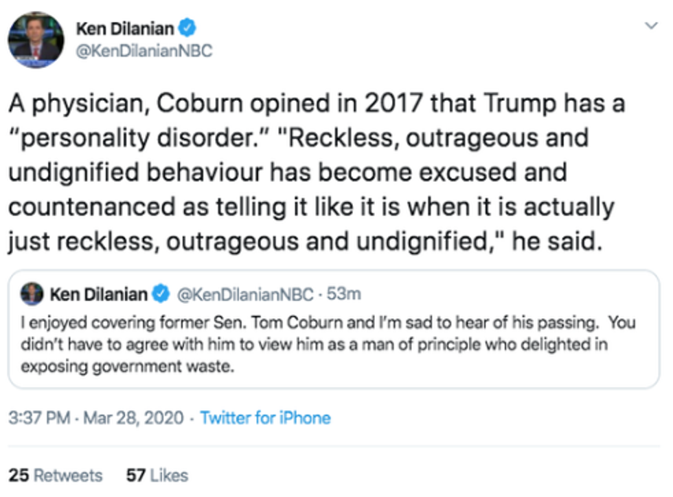 In a tweet that he later deleted, Dilanian recalled how Coburn criticized the president in 2017. "A physician, Coburn opined in 2017 that Trump has a 'personality disorder,'" he wrote. "Reckless, outrageous and undignified behaviour has become excused and countenanced as telling it like it is when it is actually just reckless, outrageous and undignified."