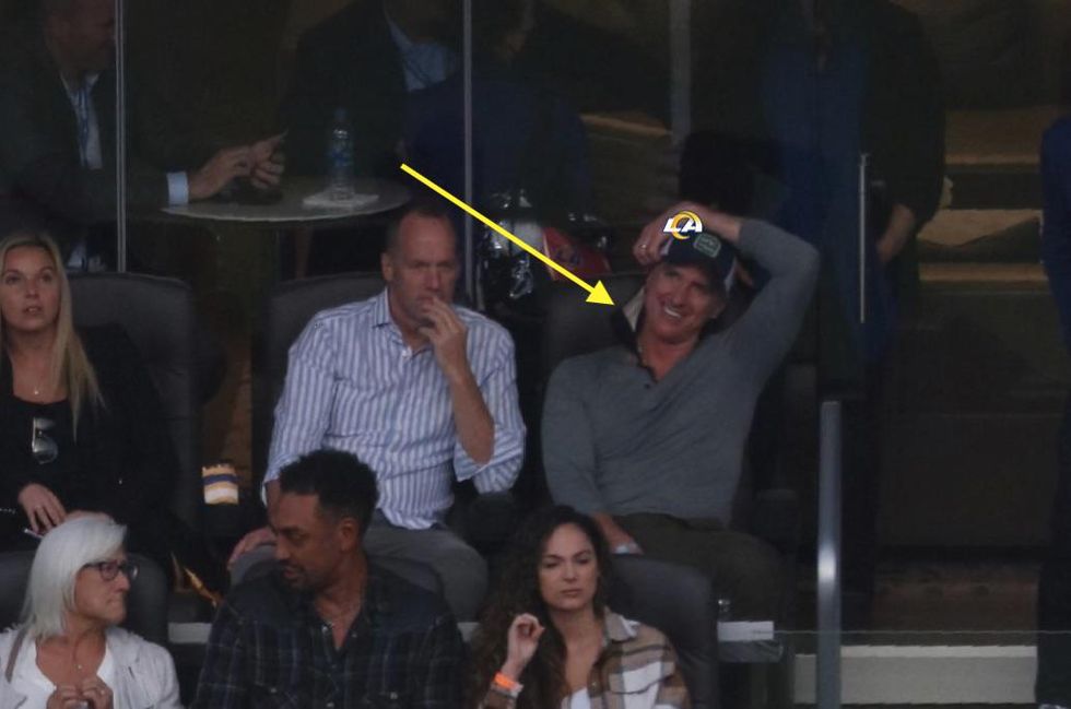 The Los Angeles Rams' "fan cam" caught Newsom without his mask on while sitting in his seat. At the time the picture was taken, it was not the "brief second" that he met with Johnson for the photograph.