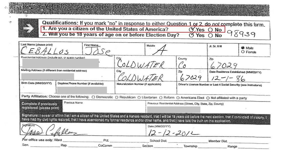 The two voter registration applications for Ceballos, one dated April 1999 and the other December 2012, indicate he established Kansas residency all the way back in 1986.