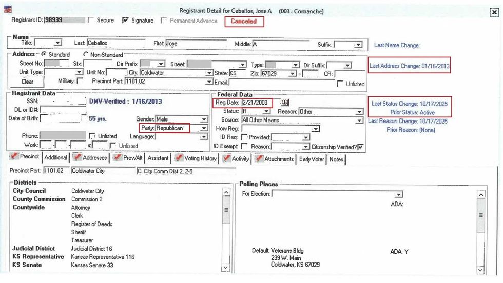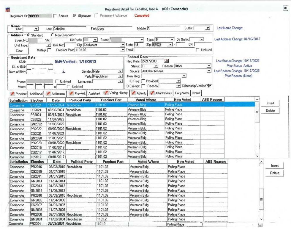 Records from the Comanche County clerk's office revealed that Ceballos' voter registration was canceled on October 17, 2025. Those records further showed that he had been registered to vote in federal elections since at least February 2003, that he was at some point registered as a Republican, and that he filed a change of address in 2013.