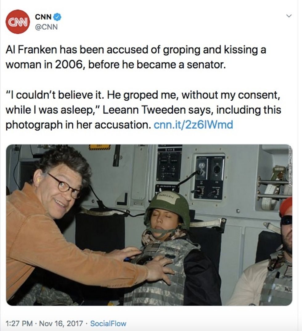 She added that Franken got back at her with "petty insults" — and then the coup de grace: A photo of Franken appearing to grope Tweeden's breasts while she slept.