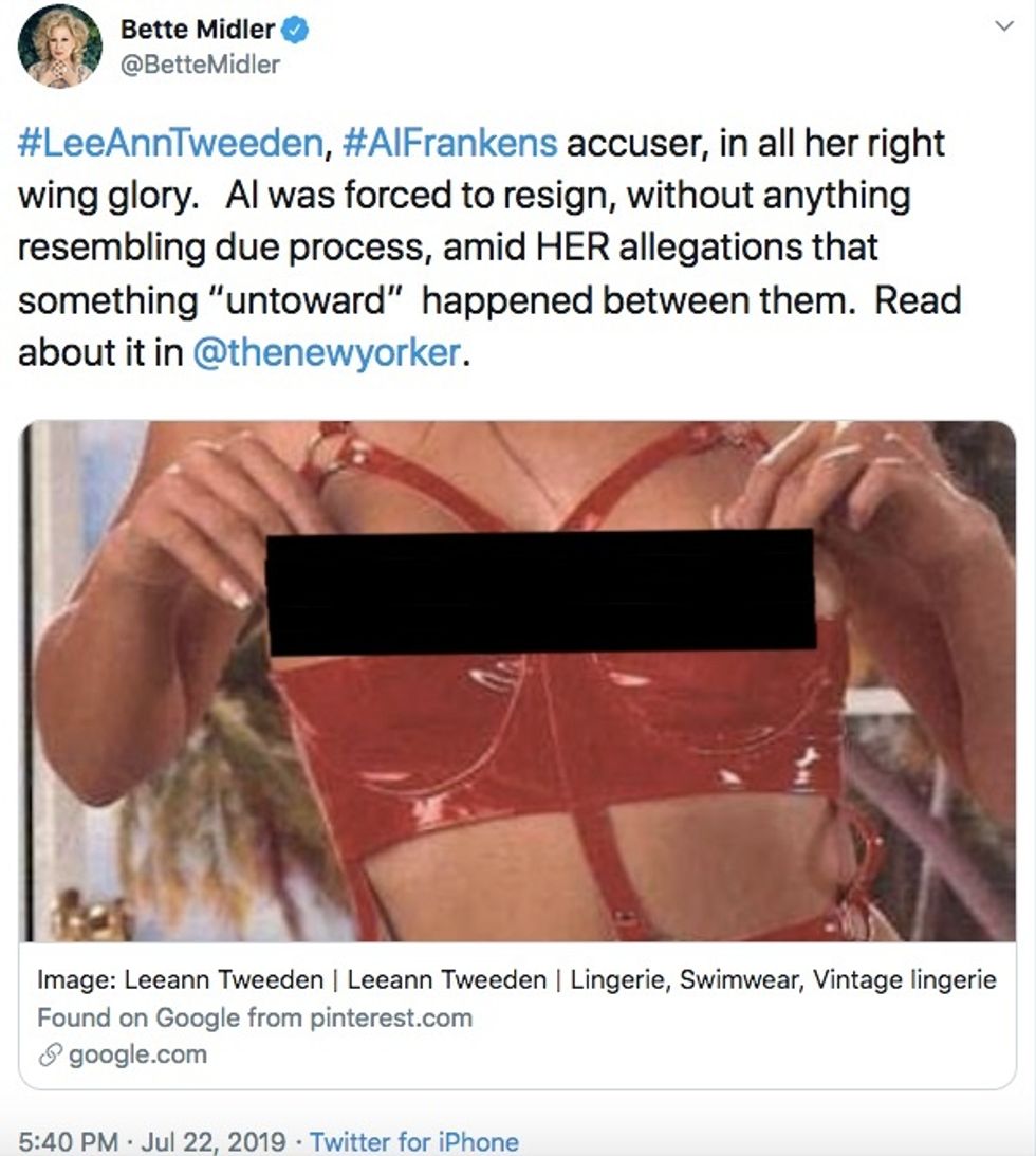 Midler on Monday tweeted an uncensored photo of a woman's torso accompanied by the following text: "(Leeann Tweeden, Al Franken's) accuser, in all her right-wing glory. Al was forced to resign, without anything resembling due process, amid HER allegations that something 'untoward' happened between them. Read about it in (the New Yorker)."