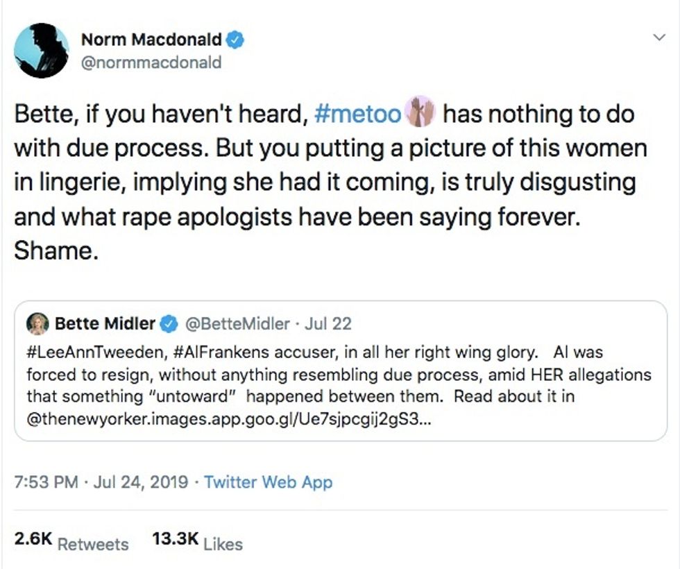 Well, comedian Norm Macdonald wasn't about to let Midler get away with that — and on Wednesday he fired off a tweet back to her: