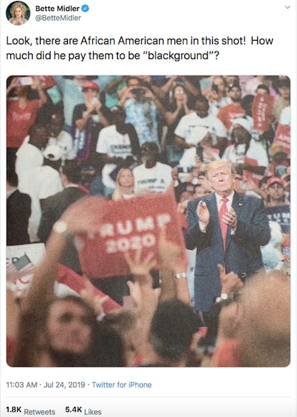 Macdonald also called Midler a "racist" after she posted a tweet claiming President Donald Trump paid black men to appear in the "blackground" of a rally audience: