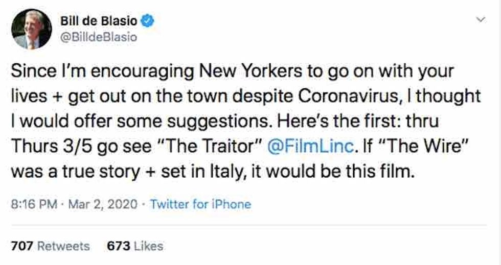 "Since I'm encouraging New Yorkers to go on with your lives + get out on the town despite Coronavirus, I thought I would offer some suggestions," the mayor tweeted March 2. "Here's the first: thru Thurs 3/5 go see 'The Traitor' ... If 'The Wire' was [sic] a true story + set in Italy, it would be this film."