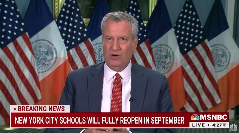 New York City Mayor Bill de Blasio (D) announced that the city's public schools will fully reopen in September after being closed during the last school year under extreme pressure from the teachers unions.