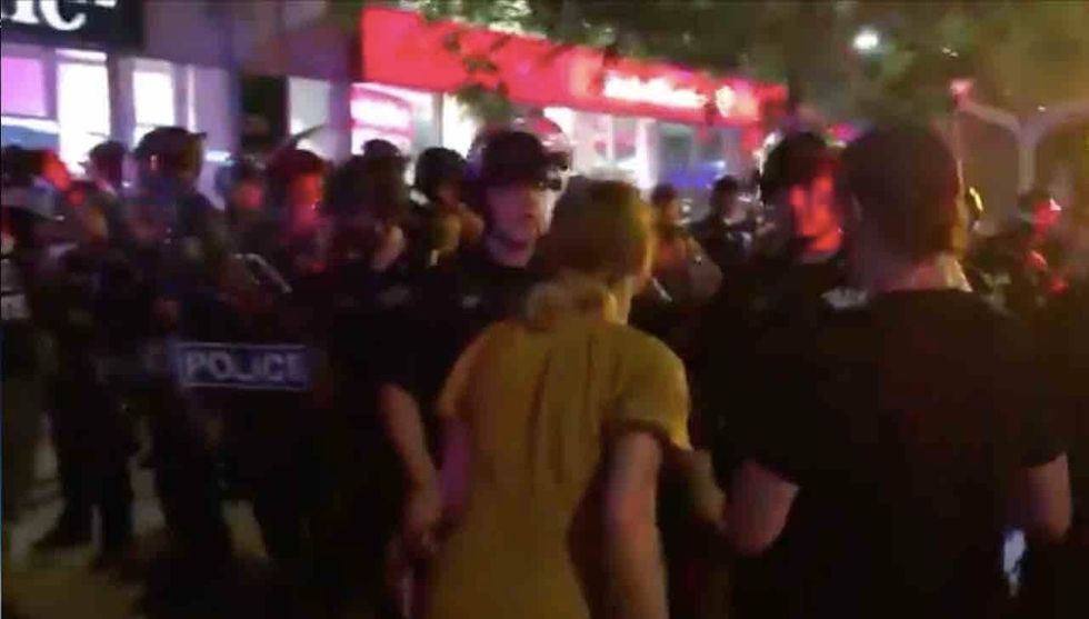 It isn't clear from the clip what the woman did after getting in the officer's face or if she made physical contact with him or other cops, but she was shoved backward — and then it was on. As she raised her hands and got combative, other officers stepped in and began restraining her as she screamed some more.