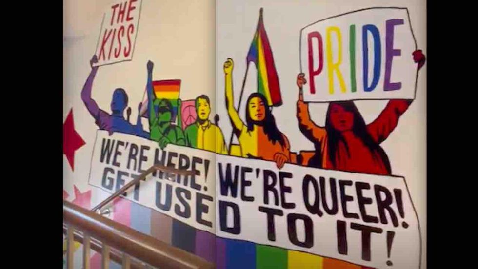 The stairwell mural depicts five protesters adorned with some colors from the LGBTQ rainbow flag holding signs that read, "The Kiss," "Pride," and "We're here! We're queer! Get used to it!"