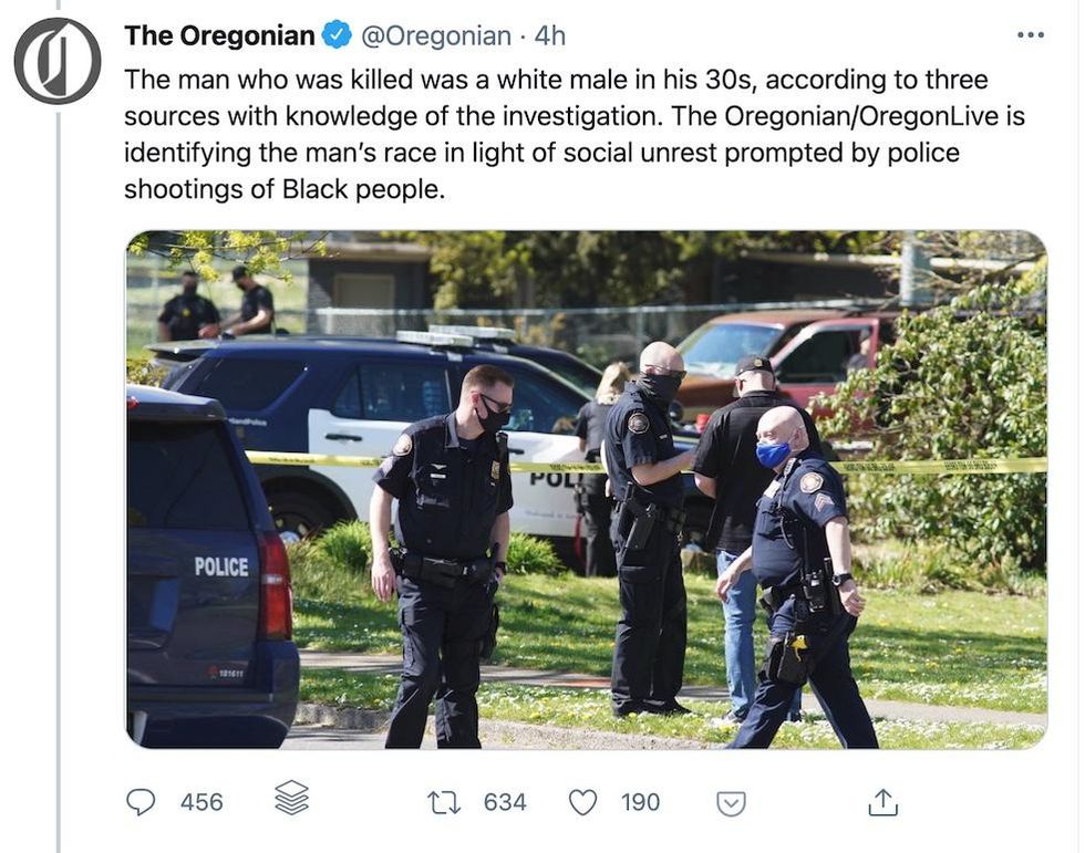 "The man who was killed was a white male in his 30s, according to three sources with knowledge of the investigation. The Oregonian/OregonLive is identifying the man's race in light of social unrest prompted by police shootings of Black people," the tweet read.