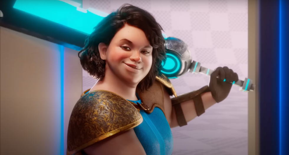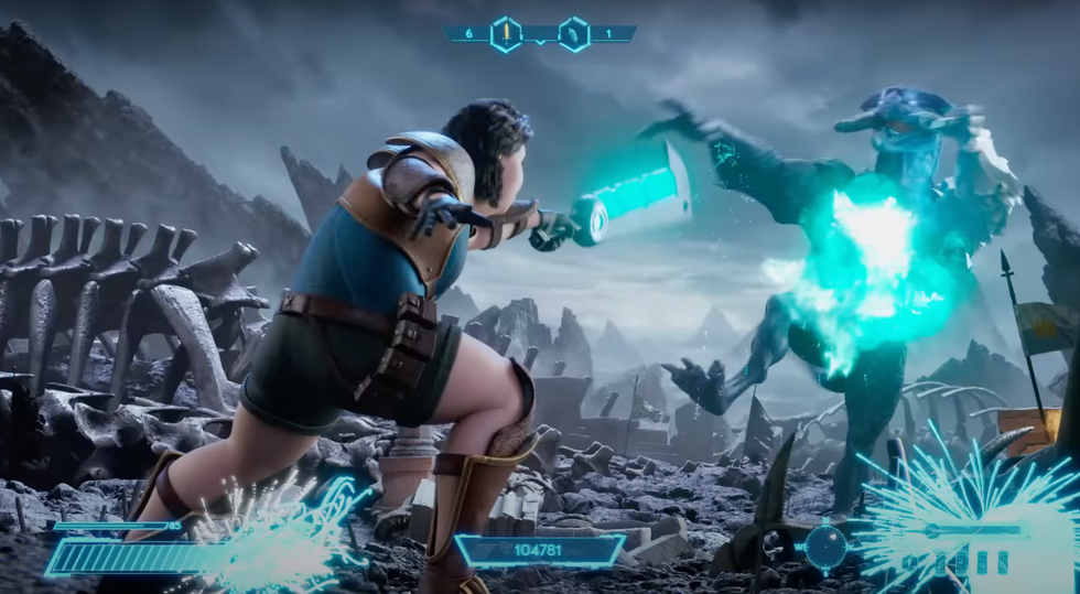 The animated video ad begins with Cinthia — an armor-clad video game character — winning a battle.