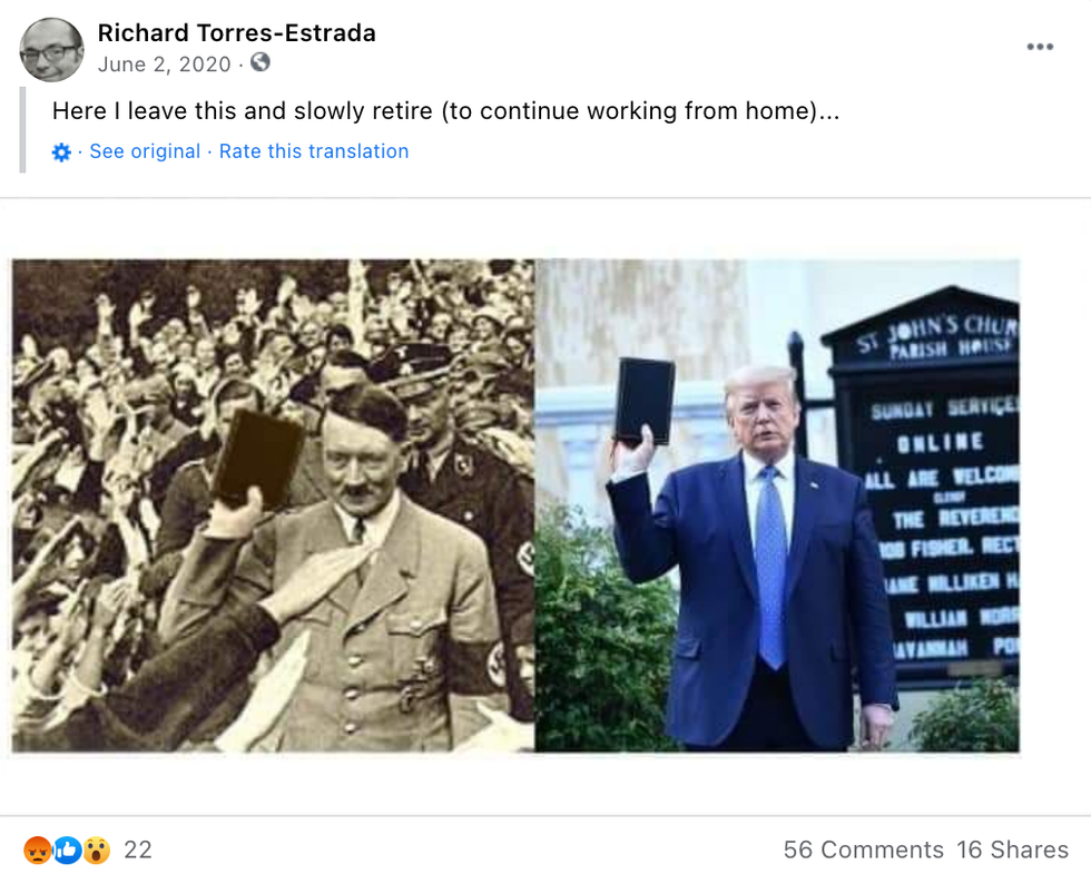 One such post, published on Facebook last June, featured a side-by-side picture of Trump and Hitler, both appearing to hold a Bible.