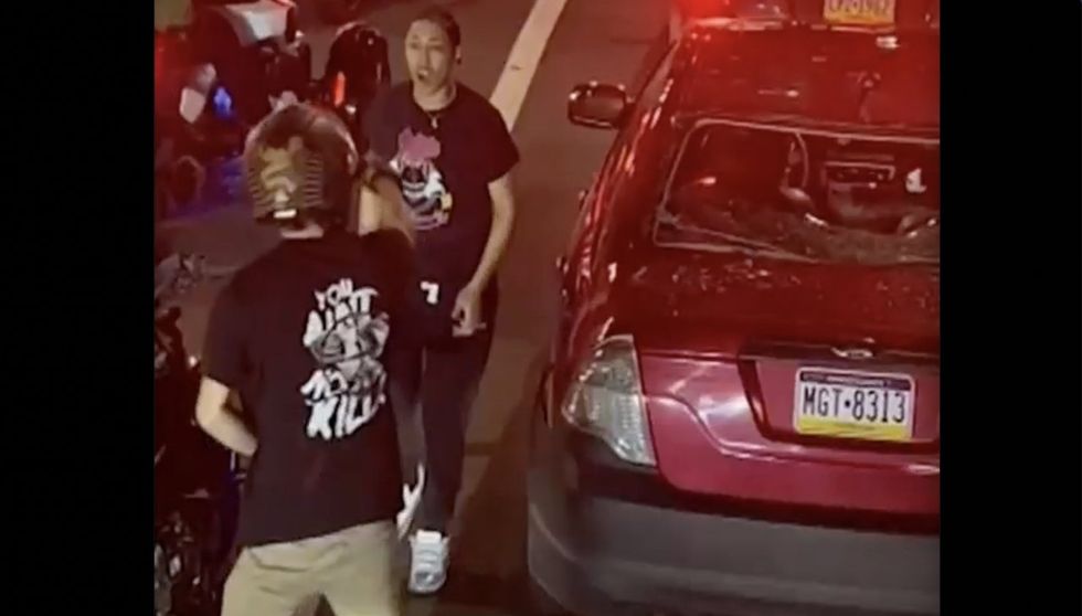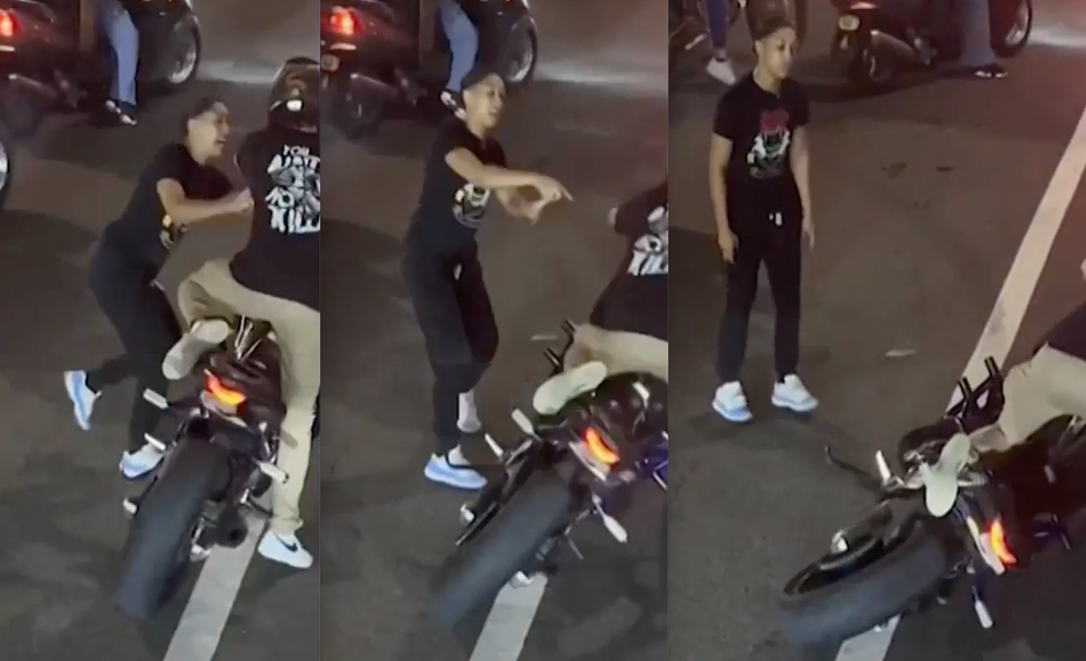 She continued trying to get in the biker's face, and the biker — who was wearing a helmet — head-butted her and shoved her.