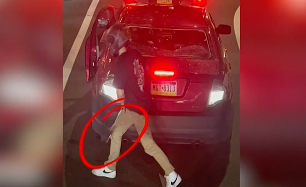 She noted to the station the biker at that point took things to another level, hopping up on her car's back bumper and stomping on the rear window before jumping high and smashing through the window with both feet.