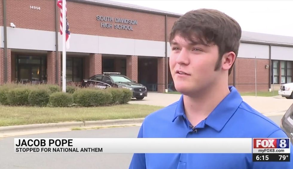 Jacob Pope, a high school football player from North Carolina, was walking to practice recently when the national anthem began playing at a nearby girls' softball game, WGHP-TV reported.