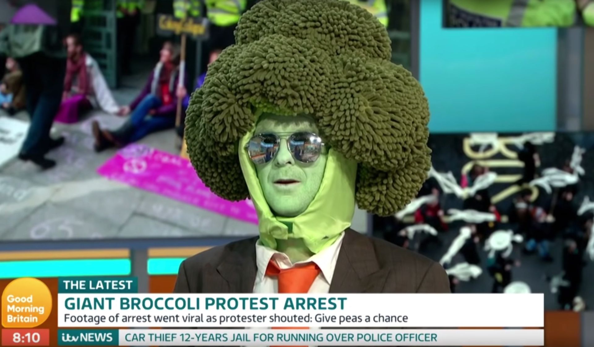Co-host Susanna Reid interjected, "Are you a plant? ... Because your argument dressed up as broccoli just strikes me as so absurd. That you're wearing a costume, but you're trying to get a serious point across about veganism. Are you actually not a part of Animal Rebellion and Extinction Rebellion at all, but somebody who's trying to send up the whole movement? Because I'm not sure you're going to win anybody over dressed as a broccoli trying to make a serious political point about how to stop climate change by changing your diet."
