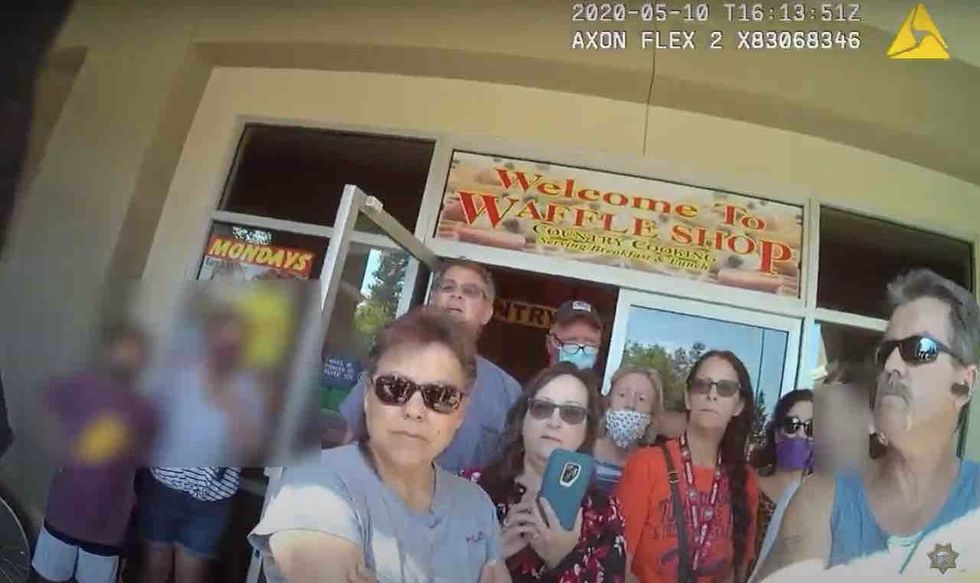 The video shows the unidentified officer speaking with code enforcement who tell him the people in front of Waffle Shop's entrance won't let them "in the damn door."
